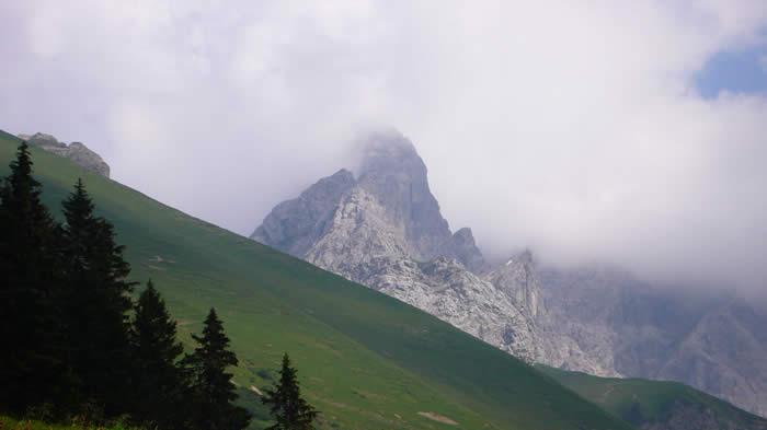 Trettachspitze wolkenverhangen, Blick von der Einödsbergalm |