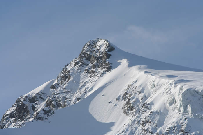 Dann noch 100 m den Grat folgend zu nächsten Scharte, wo der Grat steiler wird. Bei einem Bohrhaken (Stand) einige Meter nach rechts queren und bei einem Haken direkt hinauf zum Standplatz mit zwei Borhaken (3+). Dann noch einige Meter ausgesetzt dem Grat folgend, bis man zu einem geräumigen Plateau gelangt, wo die Steigeisen angelegt werden. Einige Meter im Fels zu einer Scharte absteigen und anschließend im Sinne des Aufstieges nach rechts in die Firnflanke queren. Diese Steilstück des Grates wird im weiten Bogen rechts umgangen (Bärenloch - Vorsicht in diesem Bereich Seracs!) und nach überschreiten eines Felsriegels (7m; 3+) erreicht man die Biwakschachtel des Lombardi Biwaks (3.316 m). Vom Biwak vorwiegend den Firnrücken aufwärts (teilweise bis 35-40° steil!) auf das Gipfelplateau (die Steilheit der Firnflanke nimmt nach oben hin immer mehr ab). Auf dem flachen Plateau (Spalten!) in einen weiten Rechtsbogen zum Gipfel des Ortlers (3.905 m).